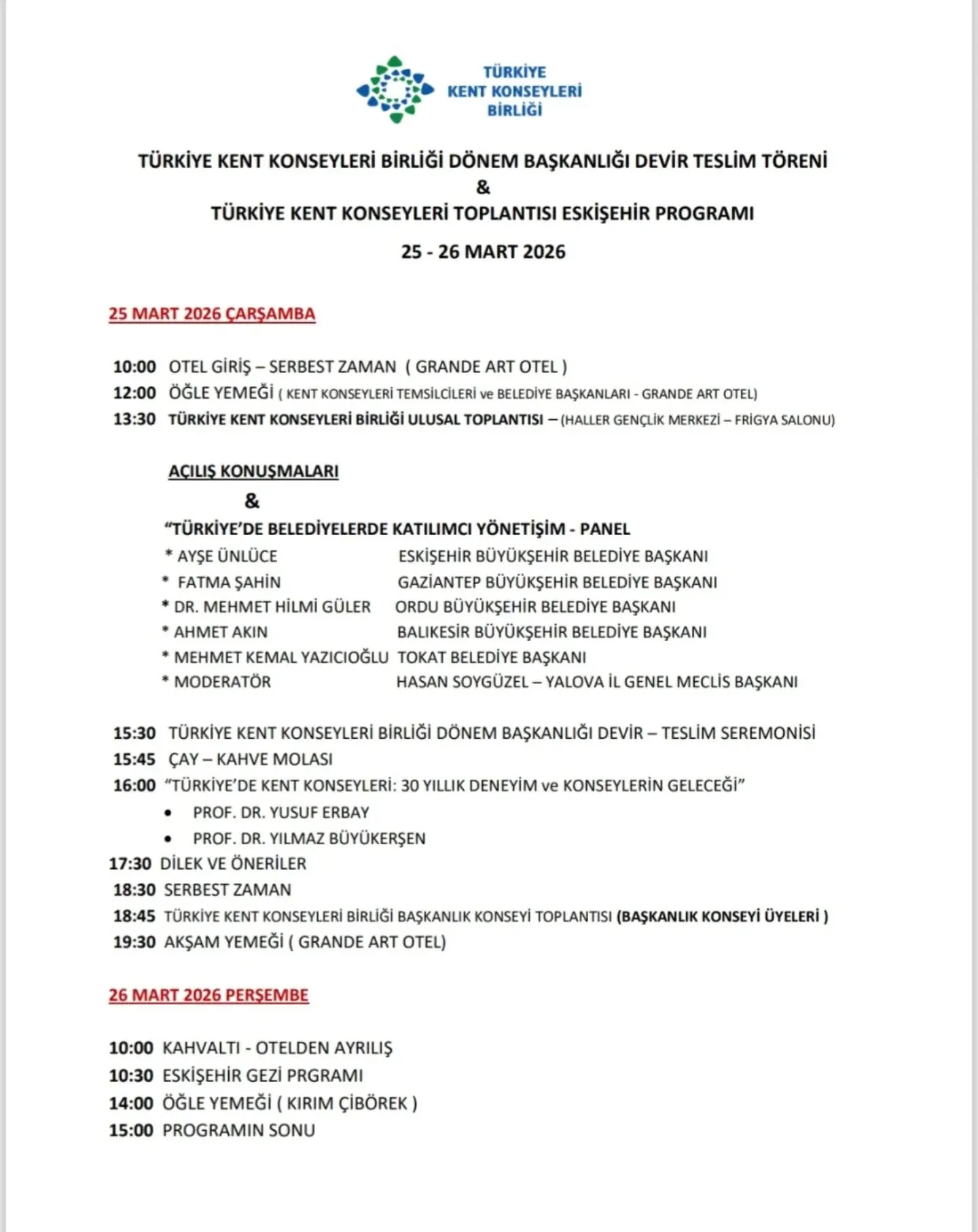 Türkiye Kent Konseyleri Birliği 17. Dönem Devir Teslim Töreni 25-26 Mart tarihlerinde Eskişehir Haller Gençlik Merkezi'nde gerçekleşti.